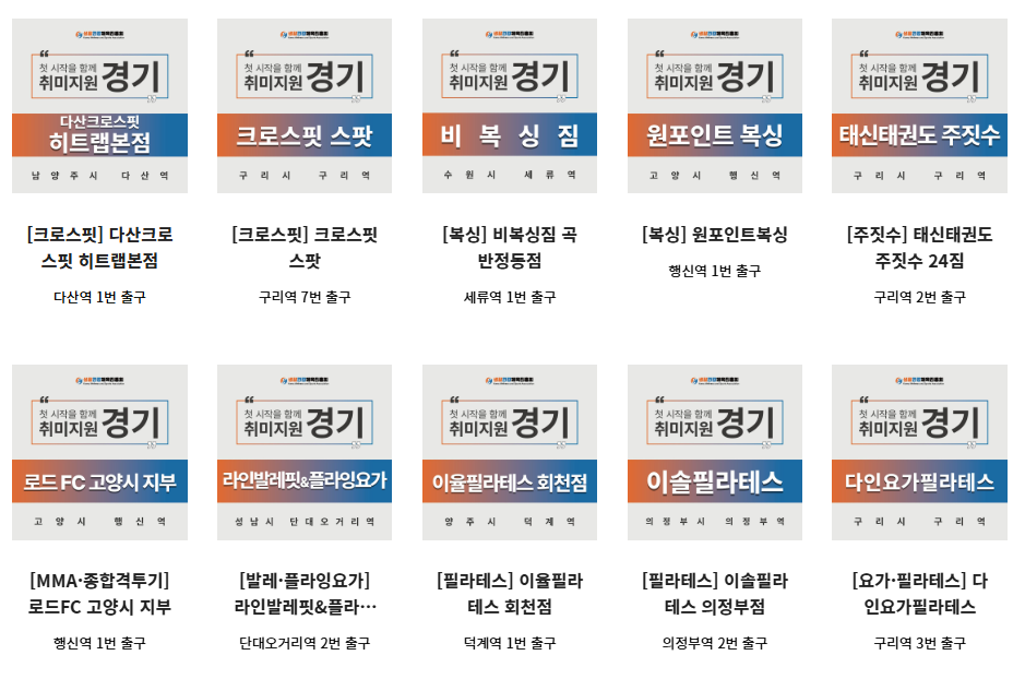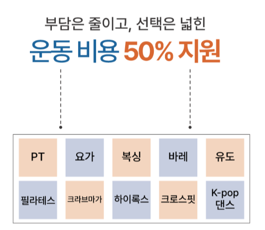 지원금은 운동비용의 50%를 지원하기 때문에 그동안 고민만 하고 해보지 못했던 운동이 있다면 선택하여 3개월간 운동을 진행할 수 있습니다.